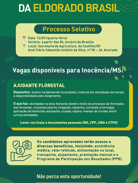 Eldorado Brasil busca ajudante florestal em Castilho via Balcão de Emprego