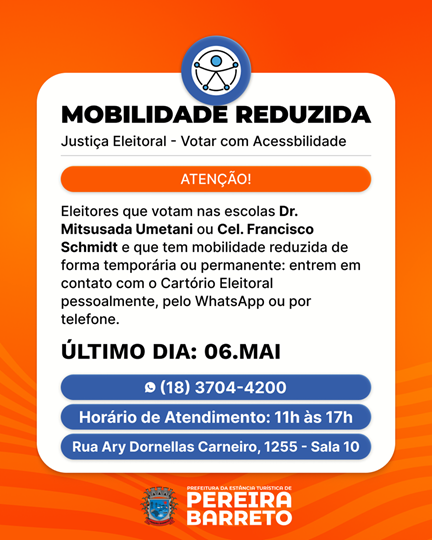 A Justiça Eleitoral, em parceria com o setor de Assessoria de Imprensa, comunica aos eleitores que possuem mobilidade reduzida, seja de forma temporária ou permanente que entrem em contato com o Cartório Eleitoral. O objetivo da ação é garantir que todos os cidadãos exerçam o direito ao voto com acessibilidade e conforto, eliminando barreiras físicas nos locais de votação.
