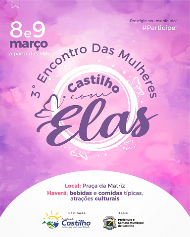 Nos dias 8 e 9 de março será realizada mais uma edição do Castilho Com Elas. Na ocasião será celebrado o “3° Encontro das Mulheres Assentadas” com total apoio e respaldo do prefeito Paulo Duarte Boaventura.”Foi a partir deste encontro ocorrido em 2022 para homenagear o Dia Internacional da Mulher que nasceu a proposta do projeto Castilho Com Elas. É uma forma de valorizar o trabalho e a produção de nossas mulheres do campo e mostrar a força que elas têm”, destaca a primeira dama Edileuza Boaventura.