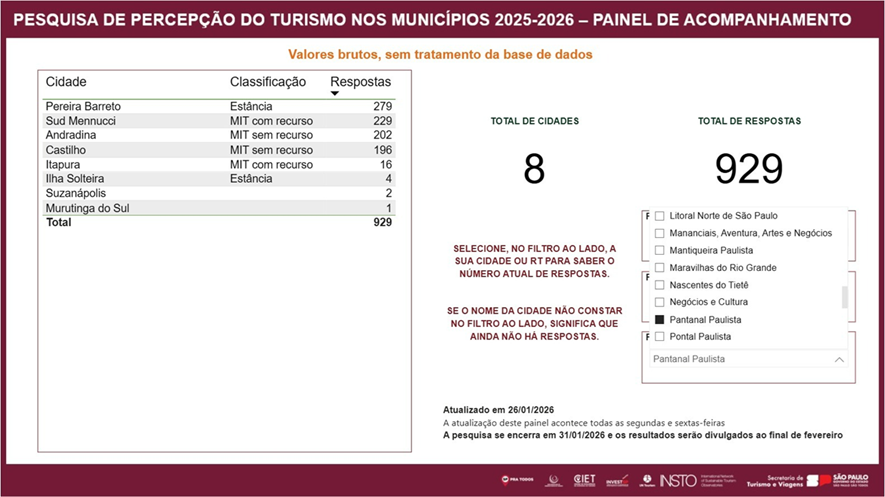O prazo final para os cidadãos participarem da pesquisa termina neste sábado, dia 31, e somente municípios que registrarem acima de 200 respostas, terão seus dados incluídos na análise técnica feita pela SeTur-SP.