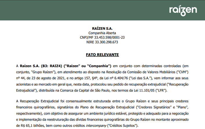 Com R$ 65,1 bilhões em dívidas, Raízen entra com pedido de recuperação extrajudicial