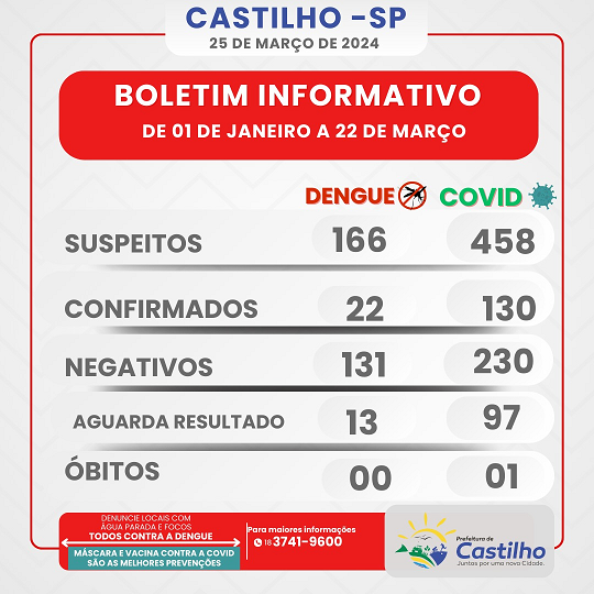 Continua aumentando gradativamente os casos de Covid-19 em Castilho. De acordo com o novo Boletim Epidemiológico divulgado nesta segunda-feira,25, houve aumento de 12 casos no espaço de uma semana. Eram 118 até 14 de março e na última sexta-feira, atingiu a marca de 130 positivos.