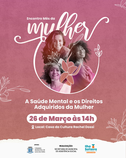 A Prefeitura de Ilha Solteira, por meio da Secretaria de Assistência Social, promove na quarta-feira, 26, a partir das 14h, o Encontro Mês da Mulher. O evento, que acontece na Casa da Cultura Rachel Dossi, terá como tema “A Saúde Mental e os Direitos Adquiridos da Mulher”. O encontro terá a presença da médica psiquiátrica Camila Cruvinel de Morais, que ministrará a palestra “Saúde Mental da Mulher”.