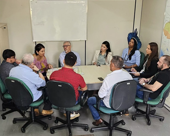 Da esquerda para a direita, Gustavo Viegas, gerente de Informações da Agricultura Familiar da CONAB; Christiane Ferreira, coordenadora de Relações Institucionais da diretoria de Projetos e Ações Integradas para os Povos da CONAFER; Luciana Alves, assessora da Secretaria Nacional Indígena da CONAFER; Ingrid Kowalczuk, assessora Técnica da Coordenação Nacional de Ações de Empreendedorismo e Sustentabilidade da CONAFER; Eduardo Soares, assessor da Diretoria de Política Agrícola e Informações da CONAB; Antonio da Silva, diretor de Projetos e Ações Integradas para os Povos da CONAFER; Kelma Cruz, superintendente de Agricultura Familiar da CONAB; Paulo Souza, secretário da Agricultura e Empreendedorismo Rural da CONAFER; Wilson Ribeiro, editor de Jornalismo da CONAFER e Edirlan Mendes, secretário de Produção Rural, Abastecimento e Pesca do município de Alvarães, no estado do Amazonas