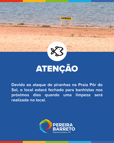 A Prefeitura da Estância Turística de Pereira Barreto informa que, devido aos recentes ataques de piranhas na Praia Pôr do Sol, o local estará fechado para banhistas nos próximos dias. De acordo com a Secretaria de Turismo uma limpeza será feita no local. Após os ataques, que tiveram início no sábado (2), a praia foi sinalizada com placas provisórias para evitar que os banhistas entrem na água.