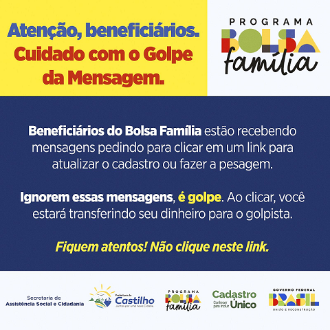 A Prefeitura de Castilho, através da Secretaria de Assistência Social e Cidadania, está alertando a população nesta terça-feira (20/02), para que os beneficiários do Program Bolsa Família fiquem atentos com mensagens recebidas por aplicativos de mensagens. “Ignorem essas mensagens, é golpe” – diz o alerta.