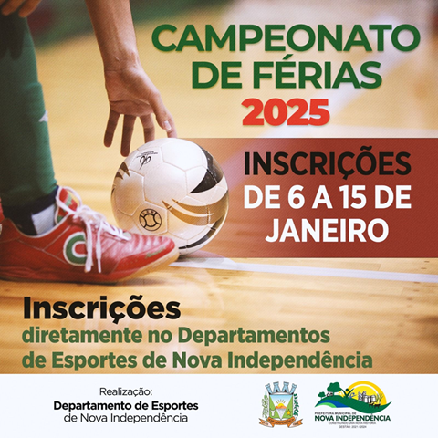 A Prefeitura de Nova Independência, através do Departamento Municipal de Esportes, está comunicando a abertura de escrições de equipes para participar da edição de 2025 do Campeonato de Futsal de Férias. Às inscrições poderão ser feitas até quarta-feira (15/01), diretamente no Departamento de Esportes de Nova Independência.