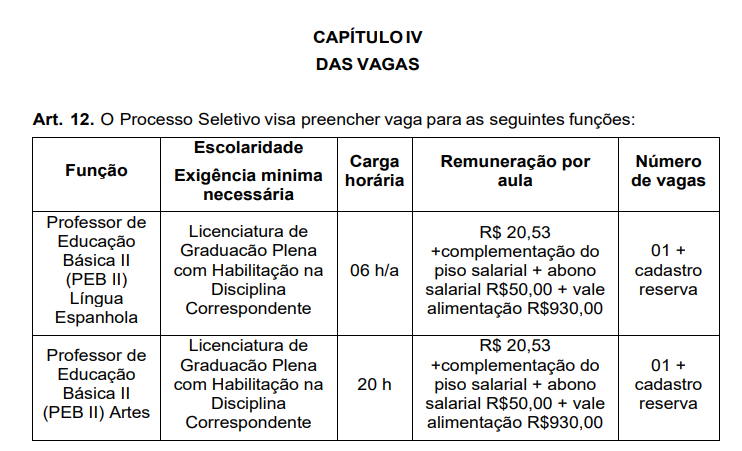 As inscrições serão gratuitas, e deverão ser realizadas diretamente mediante protocolo eletrônico no endereço processoseletivo@novaindependencia.sp.gov.br até às 19h desta quarta-feira (14/01). Os selecionado receberão R$ 20,53 por aula, mais complementação do piso salarial, abono salarial R$50,00 e vale alimentação R$ 930,00.