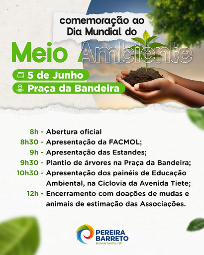 No próximo dia 5 de junho, a partir das 8h, a Praça da Bandeira será palco das celebrações do Dia Mundial do Meio Ambiente em Pereira Barreto. O evento, organizado pela Secretaria Municipal de Meio Ambiente, contará com uma série de atividades voltadas para a conscientização e preservação ambiental.