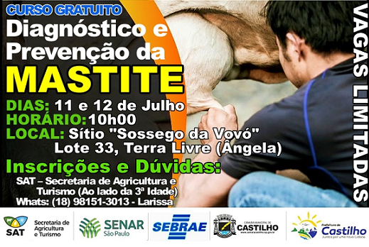 A Secretaria de Agricultura de Castilho abriu hoje (10) as inscrições para o curso presencial que ensinará aos produtores rurais de Castilho como Diagnosticar e Prevenir a ocorrência de Mastite em seus rebanhos. Realizado em parceria com o SENAR e o SEBRAE, o curso é totalmente gratuito e destinado a pecuaristas maiores de 18 anos e que tenham cursado pelo menos o 4º ano do 1º grau.
