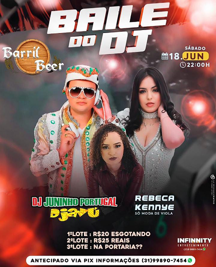 Neste sábado (18/06), na casa de shows Barril Beer em Itabira (MG) com início às 22h, às atrações ficarão por conta da Banda Djavú e DJ Juninho Portugal. Antes, a cantora local Rebeca Kennye fará a abertura dos shows. O primeiro lote de ingressos já está esgotado. O segundo lote está disponível por R$ 25,00 e podem ser adquiridos pelo WhatsApp (31) 99890-7454.