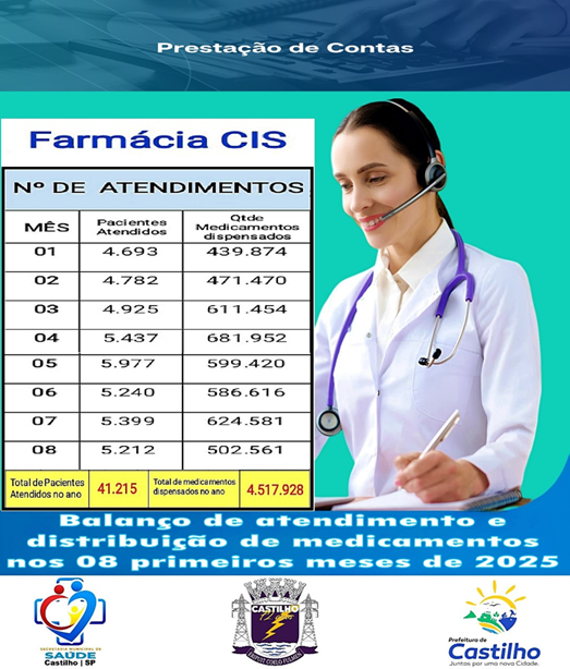 Os dados divulgados hoje apresentam um Raio-X do atendimento ao público realizado pela Farmácia Municipal e também a quantidade de medicamentos entregues aos pacientes durante os oito primeiros meses de 2025. De acordo com o balanço, 41.215 cidadãos utilizaram os serviços da Farmácia Municipal e levaram consigo um total de 4.517.928 unidades de medicamentos durante o período.