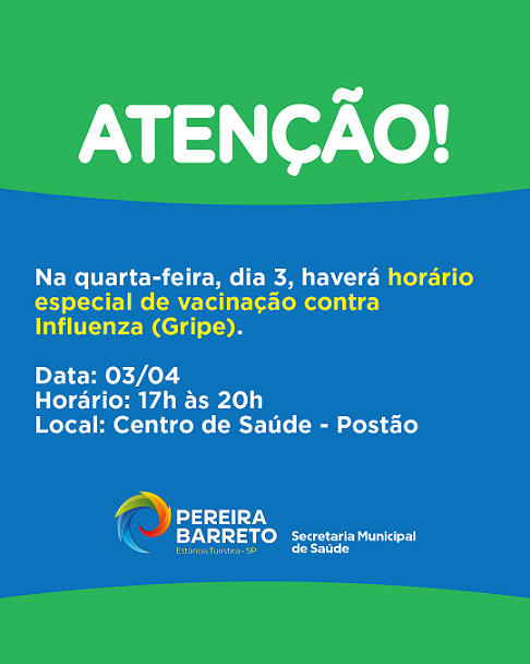 Desde a última segunda-feira (25), as UBS (Unidades Básicas de Saúde) de Pereira Barreto deram início a campanha de vacinação contra a Influenza. A imunização acontece de segunda a sexta-feira, das 7h30 às 16h. Para melhor atender o público alvo, a Secretaria Municipal de Saúde realizará um horário especial de vacinação na quarta-feira, dia 3.