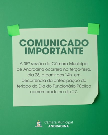 A Câmara Municipal de Andradina informa que a 35ª Sessão Ordinária, inicialmente marcada para segunda-feira (27), foi transferida para a terça-feira (28), às 14h. A alteração ocorre em razão do ponto facultativo do Dia do Servidor Público, que seria celebrado na terça-feira (28), mas foi antecipado pela Prefeitura local para a segunda-feira (27).